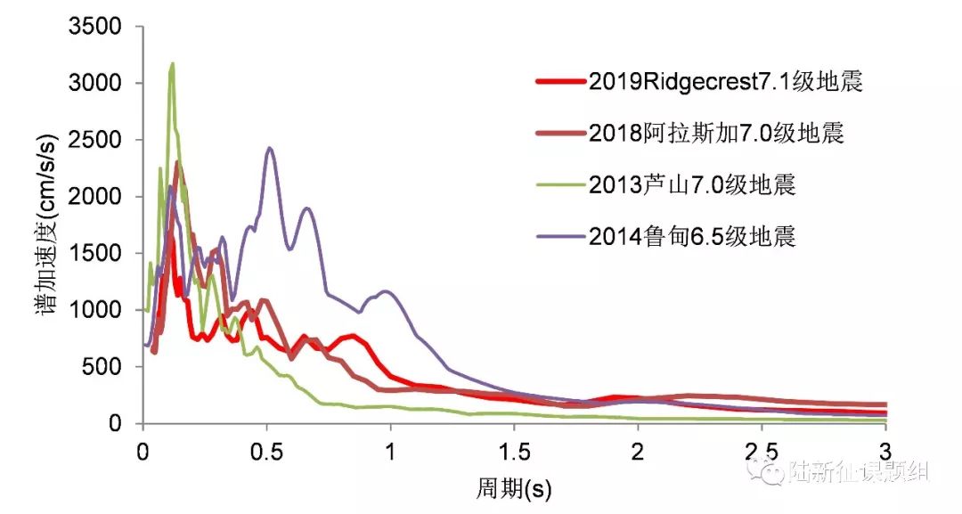 從圖3對(duì)比可以清晰看出,這兩次美國(guó)地震引起的地面運(yùn)動(dòng)反應(yīng)譜實(shí)際上并不是非常強(qiáng)烈,比魯?shù)榈卣疬€差不少。所以,簡(jiǎn)單從震級(jí)來(lái)判斷地面運(yùn)動(dòng)強(qiáng)度進(jìn)而預(yù)估災(zāi)情,是存在巨大的不確定性的。