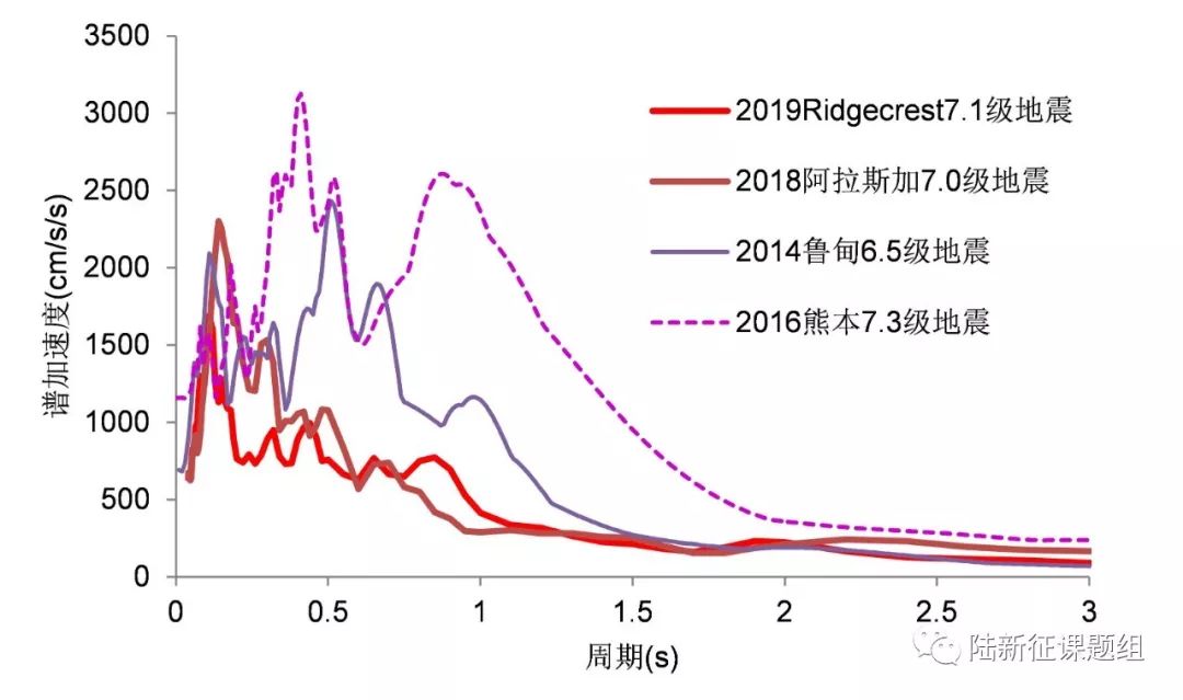 那讀者可能會(huì)問(wèn),這幾個(gè)7級(jí)左右地震看著都差不多大,那會(huì)不會(huì)魯?shù)榈卣鹗莻€(gè)特例呢?再給大家一個(gè)例子,圖4給出了2016年日本熊本7.3級(jí)地震記錄到的最強(qiáng)反應(yīng)譜。從圖中不難看出,美國(guó)建筑這兩年算是通過(guò)了“中級(jí)”難度的考驗(yàn),還沒(méi)有達(dá)到魯?shù)檫@種“高級(jí)”難度,更距離熊本這樣的“地獄”難度差得遠(yuǎn)。