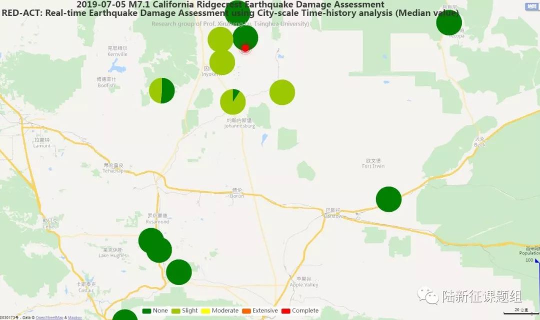7月7日早上,美方終于正式公布了其近場(chǎng)臺(tái)站處理后的地面運(yùn)動(dòng)記錄。經(jīng)過(guò)濾波、糾偏等處理后,地震動(dòng)的破壞力又有所降低,RED-ACT分析得到的建筑破壞分析結(jié)果如圖7所示。實(shí)際上如果我們從一開(kāi)始就不依賴(lài)美方處理強(qiáng)震記錄而是直接從臺(tái)站獲取數(shù)據(jù),我們可以在地震后馬上給出類(lèi)似的震害分布結(jié)果。