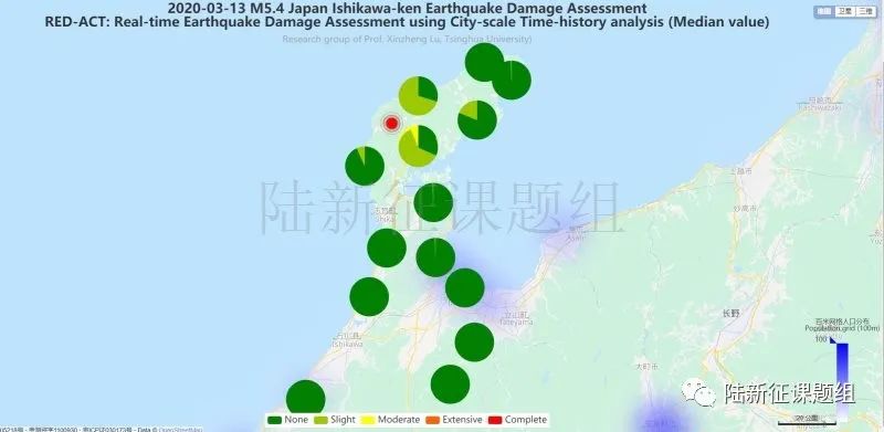 利用密布強(qiáng)震臺(tái)網(wǎng)在震后獲取的實(shí)時(shí)地震動(dòng)信息,再結(jié)合城市抗震彈塑性分析,就可以得到地震發(fā)生后不同地點(diǎn)的建筑破壞情況,為抗震救災(zāi)決策提供科學(xué)支撐。圖3為根據(jù)20200313日本本州5.4級(jí)地震震中附近范圍內(nèi)臺(tái)站記錄分析得到的建筑震害分布示意圖。圖4為根據(jù)20200313日本本州5.4級(jí)地震震中附近范圍內(nèi)臺(tái)站記錄分析得到的人員加速度感受分布示意圖。