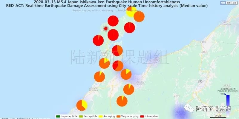 圖420200313日本本州5.4級(jí)地震不同臺(tái)站地震記錄人員加速度感受分布圖