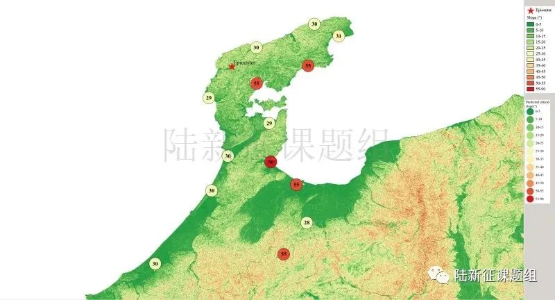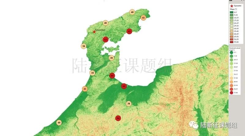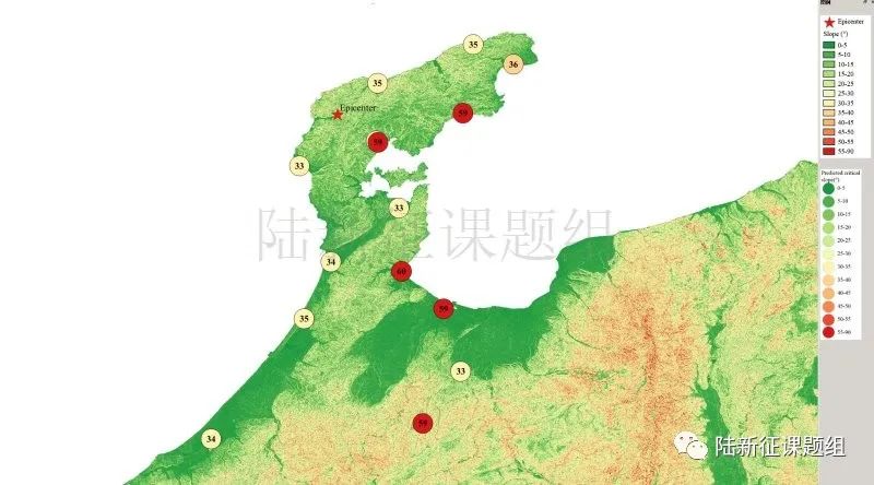 根據(jù)當(dāng)?shù)氐匦螖?shù)據(jù)、巖性數(shù)據(jù)和實(shí)測(cè)地面運(yùn)動(dòng)記錄,可以計(jì)算得到不同滑坡體飽和比例下的滑坡分布,如圖5所示。其中,底圖為當(dāng)?shù)仄露确植紙D,每個(gè)圓圈代表每個(gè)臺(tái)站的計(jì)算結(jié)果,圓圈中的數(shù)字代表發(fā)生滑坡的臨界坡度,臺(tái)站附近坡度大于該數(shù)值的地方滑坡發(fā)生概率高。