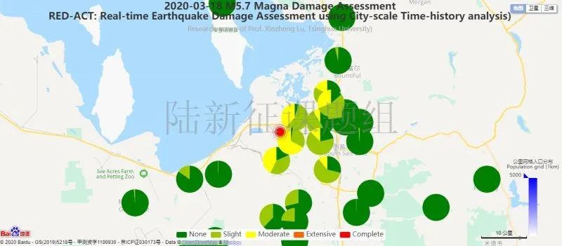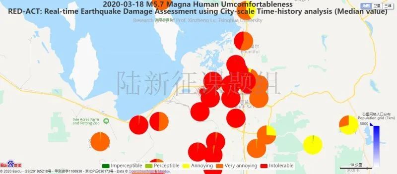 利用密布強(qiáng)震臺(tái)網(wǎng)在震后獲取的實(shí)時(shí)地震動(dòng)信息,再結(jié)合城市抗震彈塑性分析,就可以得到地震發(fā)生后不同地點(diǎn)的建筑破壞情況,為抗震救災(zāi)決策提供科學(xué)支撐。圖4為根據(jù)20200318美國(guó)猶他州麥格納5.7級(jí)地震震中附近范圍內(nèi)臺(tái)站記錄分析得到的建筑震害分布示意圖。圖5為根據(jù)20200318美國(guó)猶他州麥格納5.7級(jí)地震震中附近范圍內(nèi)臺(tái)站記錄分析得到的人員加速度感受分布示意圖。