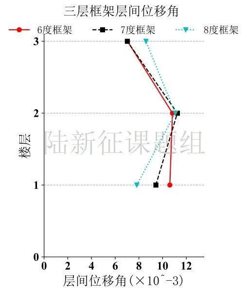 將LKC臺(tái)站記錄輸入立面布置如圖6 (a)所示的6度、7度和8度設(shè)防的典型三層鋼筋混凝土框架結(jié)構(gòu),得到其層間位移角包絡(luò)如圖6 (b)所示。