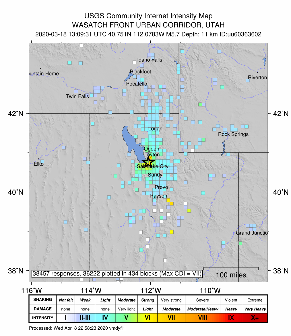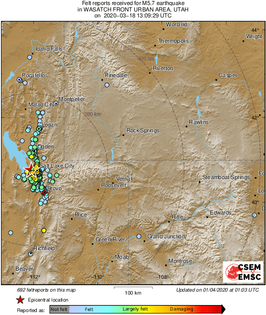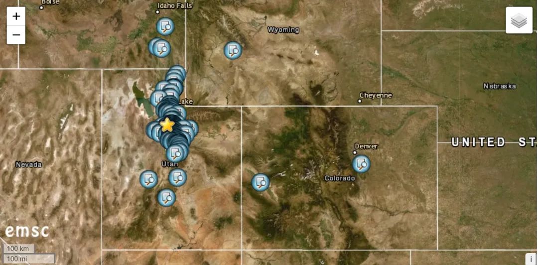 據(jù)美國(guó)CESMD正式測(cè)定,3月18日07時(shí)09分(UTC -6)在美國(guó)猶他州麥格納發(fā)生5.7級(jí)地震,震源深度11.7千米,震中位于北緯40.75度,西經(jīng)112.07度。