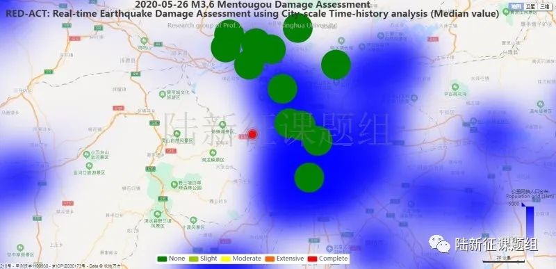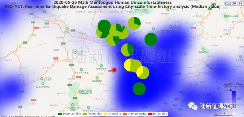 利用密布強(qiáng)震臺(tái)網(wǎng)在震后獲取的實(shí)時(shí)地震動(dòng)信息,再結(jié)合城市抗震彈塑性分析,就可以得到地震發(fā)生后不同地點(diǎn)的建筑破壞情況,為抗震救災(zāi)決策提供科學(xué)支撐。圖3為根據(jù)20200526北京門(mén)頭溝區(qū)3.6級(jí)地震震中附近范圍內(nèi)臺(tái)站記錄分析得到的建筑震害分布示意圖。圖4為根據(jù)20200526北京門(mén)頭溝區(qū)3.6級(jí)地震震中附近范圍內(nèi)臺(tái)站記錄分析得到的人員加速度感受分布示意圖。