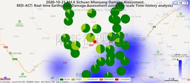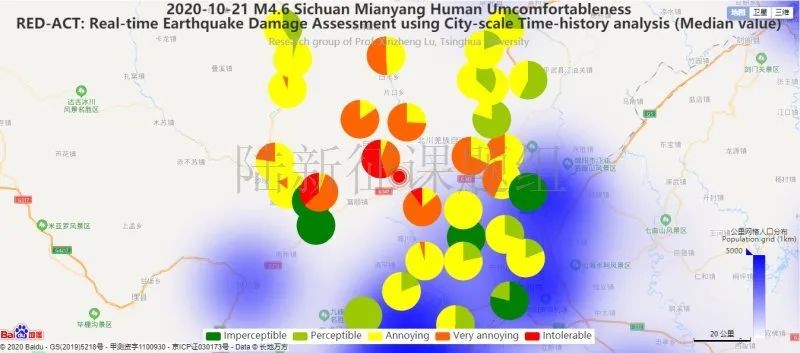 利用密布強(qiáng)震臺(tái)網(wǎng)在震后獲取的實(shí)時(shí)地震動(dòng)信息,再結(jié)合城市抗震彈塑性分析,就可以得到地震發(fā)生后不同地點(diǎn)的建筑破壞情況,為抗震救災(zāi)決策提供科學(xué)支撐。圖4為根據(jù)本次地震震中附近范圍內(nèi)臺(tái)站記錄分析得到的建筑震害分布示意圖。圖5為根據(jù)本次地震震中附近范圍內(nèi)臺(tái)站記錄分析得到的人員加速度感受分布示意圖。