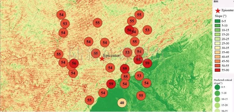 根據(jù)當(dāng)?shù)氐匦螖?shù)據(jù)、巖性數(shù)據(jù)和實(shí)測(cè)地面運(yùn)動(dòng)記錄,可以計(jì)算得到不同滑坡體飽和比例下的滑坡分布,如圖6所示。其中,底圖為當(dāng)?shù)仄露确植紙D,每個(gè)圓圈代表每個(gè)臺(tái)站的計(jì)算結(jié)果,圓圈中的數(shù)字代表發(fā)生滑坡的臨界坡度,臺(tái)站附近坡度大于該數(shù)值的地方滑坡發(fā)生概率高。