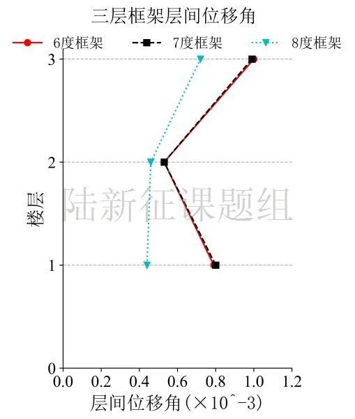 將典型臺(tái)站記錄輸入立面布置如圖7 (a)所示的6度、7度和8度設(shè)防的典型三層鋼筋混凝土框架結(jié)構(gòu),得到其層間位移角包絡(luò)如圖7 (b)所示。