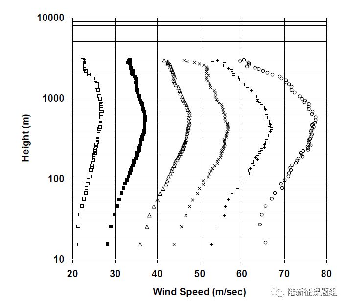 圖3 Hazus中最大風(fēng)速半徑附近平均風(fēng)速與高度關(guān)系