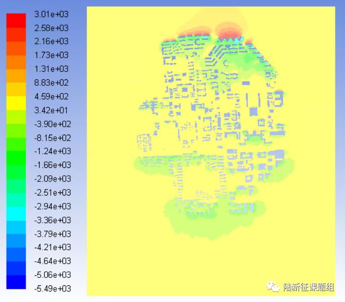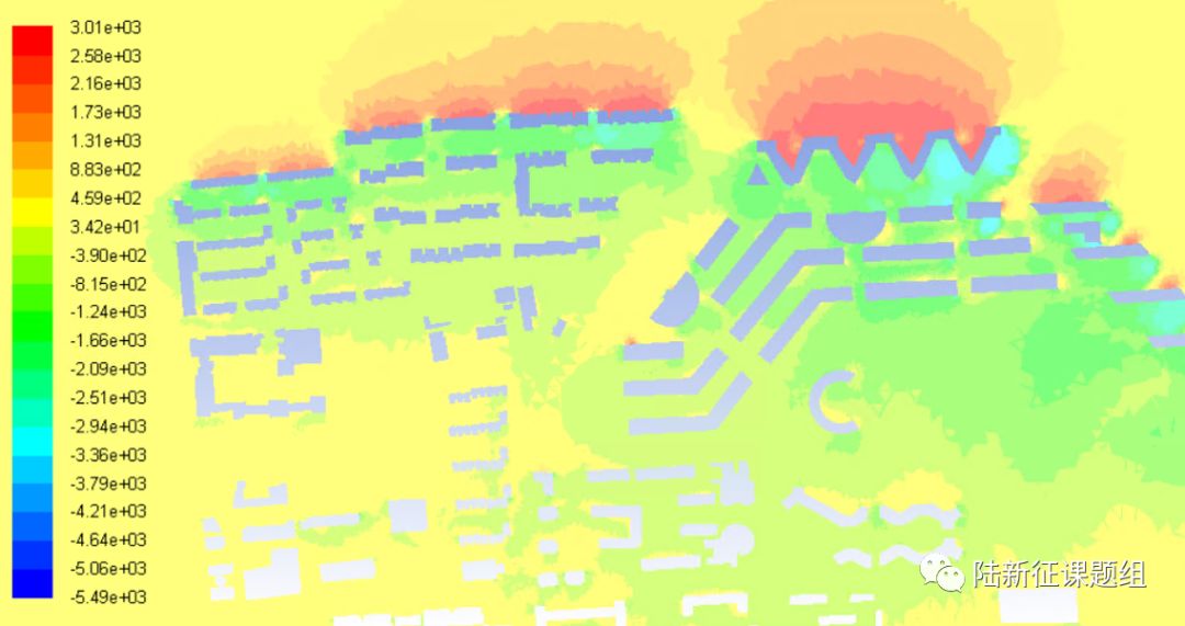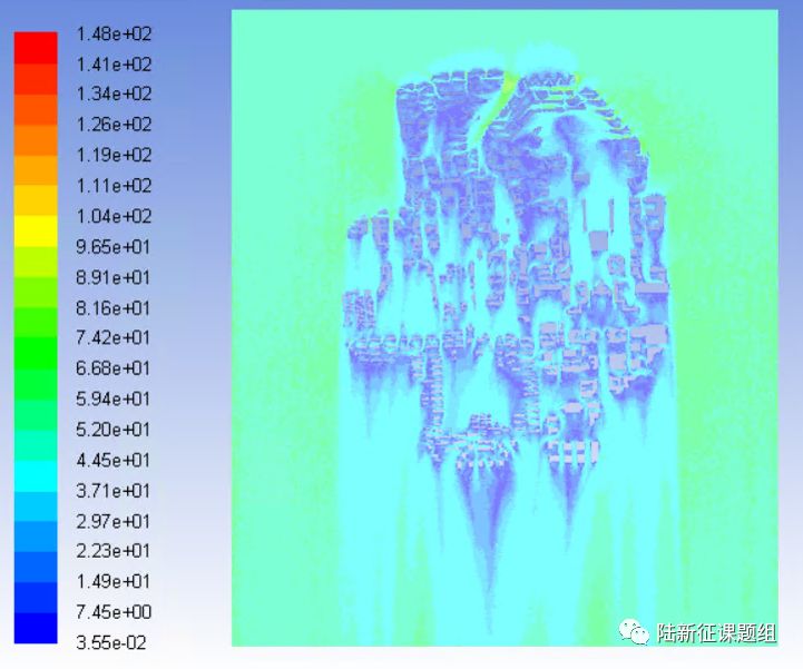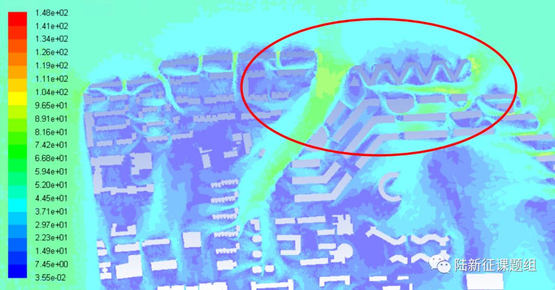清華校園高度1.5m剖面的平均風(fēng)速分布如圖4所示??傮w來看,校園大部分區(qū)域平均風(fēng)速在40m/s左右,建筑后方小塊區(qū)域的平均風(fēng)速可以降到20m/s左右,但仍然嚴(yán)重影響人類活動(dòng)。但是由于建筑物形成的“風(fēng)道”效應(yīng),部分區(qū)域局部平均風(fēng)速(如校園最北面的紫荊學(xué)生公寓附近)會(huì)有顯著增加,如圖5所示。