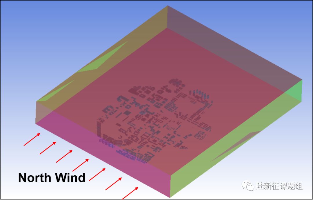 分析對象為整個(gè)清華校園,清華校園建筑群占地面積為1.855km×2.255km,最高建筑高度為78m,平面圖如圖1所示。CFD計(jì)算域?yàn)?.104km×3.621km×0.580km,其中上游長度0.352km,下游長度1.014km,建筑邊界距計(jì)算域兩側(cè)邊界均為0.624km,滿足COST 732和AIJ對區(qū)域CFD模擬的相關(guān)要求。計(jì)算域示意圖如圖2所示。