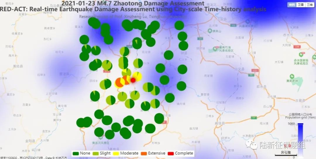利用密布強(qiáng)震臺(tái)網(wǎng)在震后獲取的實(shí)時(shí)地震動(dòng)信息,再結(jié)合城市抗震彈塑性分析,就可以得到地震發(fā)生后不同地點(diǎn)的建筑破壞情況,為抗震救災(zāi)決策提供科學(xué)支撐。圖4為根據(jù)本次地震震中附近范圍內(nèi)臺(tái)站記錄分析得到的建筑震害分布示意圖。圖5為根據(jù)本次地震震中附近范圍內(nèi)臺(tái)站記錄分析得到的人員加速度感受分布示意圖。