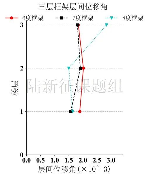 將典型臺(tái)站記錄輸入立面布置如圖7 (a)所示的6度、7度和8度設(shè)防的典型三層鋼筋混凝土框架結(jié)構(gòu),得到其層間位移角包絡(luò)如圖7 (b)所示。