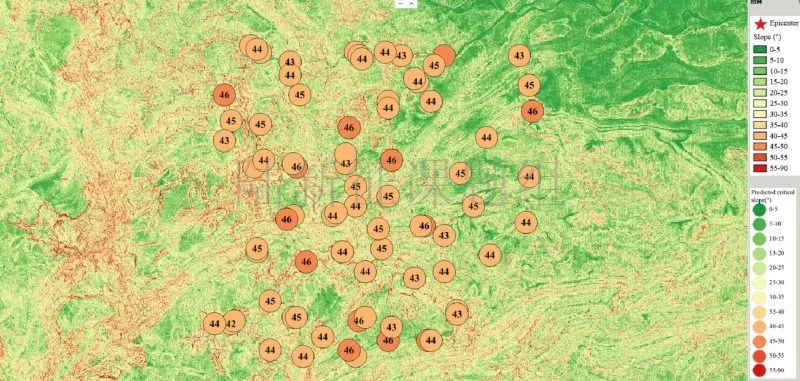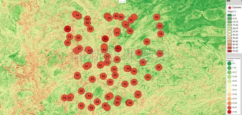 根據(jù)當(dāng)?shù)氐匦螖?shù)據(jù)、巖性數(shù)據(jù)和實(shí)測(cè)地面運(yùn)動(dòng)記錄,可以計(jì)算得到不同滑坡體飽和比例下的滑坡分布,如圖6所示。其中,底圖為當(dāng)?shù)仄露确植紙D,每個(gè)圓圈代表每個(gè)臺(tái)站的計(jì)算結(jié)果,圓圈中的數(shù)字代表發(fā)生滑坡的臨界坡度,臺(tái)站附近坡度大于該數(shù)值的地方滑坡發(fā)生概率高。