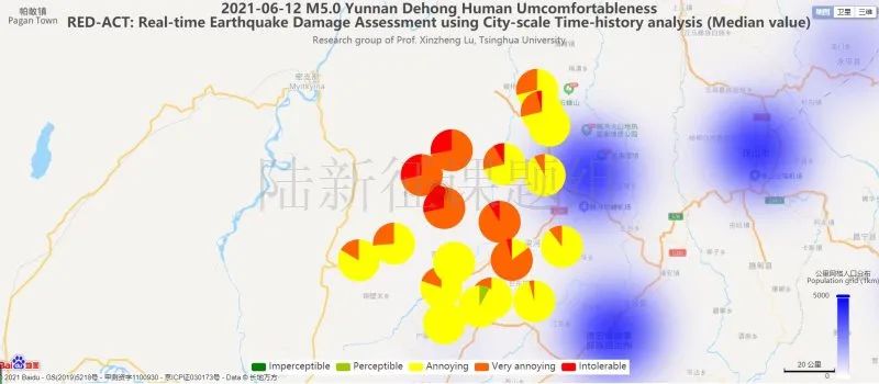 圖5 20210612云南德宏州盈江縣5.0級(jí)地震不同臺(tái)站地震記錄人員加速度感受分布圖