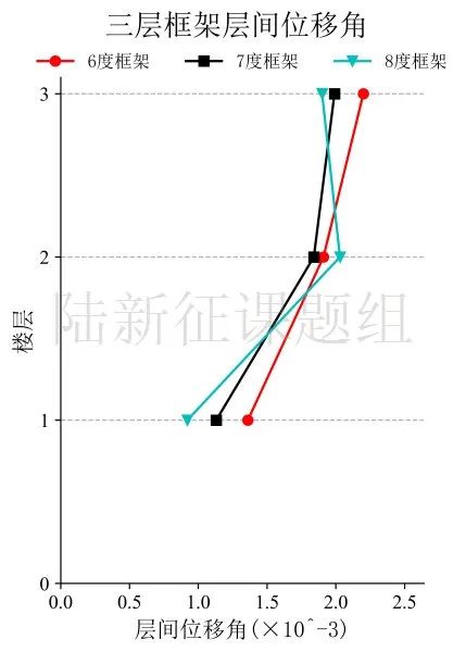 將典型臺(tái)站記錄輸入立面布置如圖7(a)所示的6度、7度和8度設(shè)防的典型三層鋼筋混凝土框架結(jié)構(gòu),得到其層間位移角包絡(luò)如圖7(b)所示。