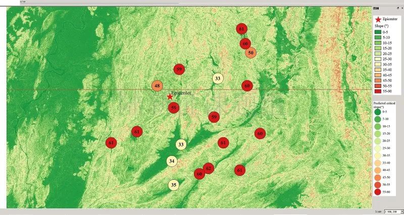 根據(jù)當(dāng)?shù)氐匦螖?shù)據(jù)、巖性數(shù)據(jù)和實(shí)測(cè)地面運(yùn)動(dòng)記錄,可以計(jì)算得到不同滑坡體飽和比例下的滑坡分布,如圖6所示。其中,底圖為當(dāng)?shù)仄露确植紙D,每個(gè)圓圈代表每個(gè)臺(tái)站的計(jì)算結(jié)果,圓圈中的數(shù)字代表發(fā)生滑坡的臨界坡度,臺(tái)站附近坡度大于該數(shù)值的地方滑坡發(fā)生概率高。