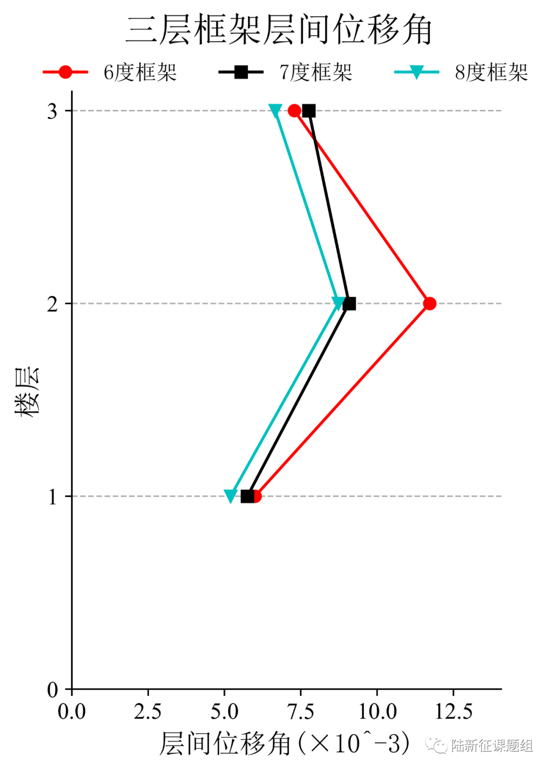 將典型臺(tái)站記錄SCK2803輸入立面布置如圖6 (a)所示的6度、7度和8度設(shè)防的典型三層鋼筋混凝土框架結(jié)構(gòu),得到其層間位移角包絡(luò)如圖6 (b)所示。
