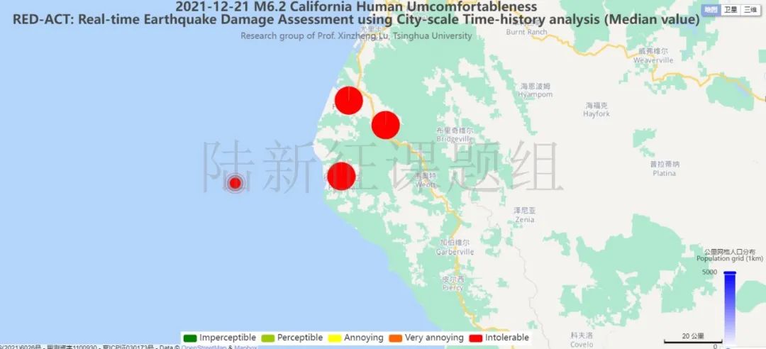圖4 20211221美國(guó)加利福尼亞州沿岸近海6.1級(jí)地震不同臺(tái)站地震記錄人員加速度感受分布圖