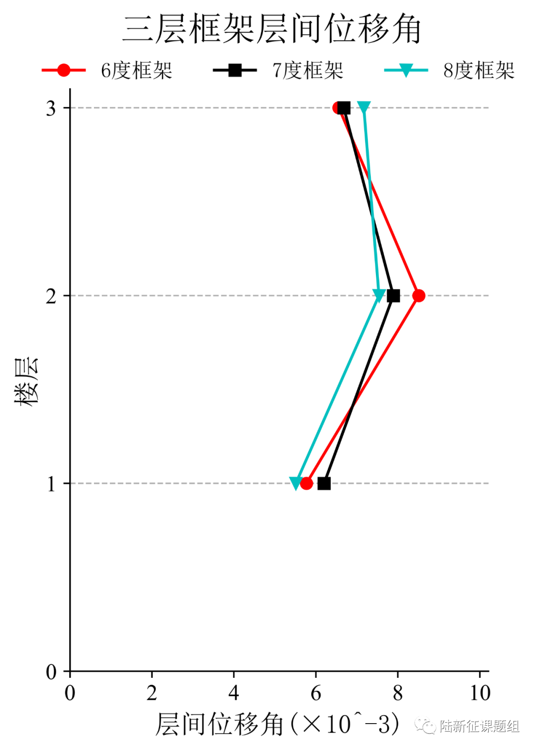 將典型臺(tái)站記錄輸入立面布置如圖5(a)所示的6度、7度和8度設(shè)防的典型三層鋼筋混凝土框架結(jié)構(gòu),得到其層間位移角包絡(luò)如圖5(b)所示。