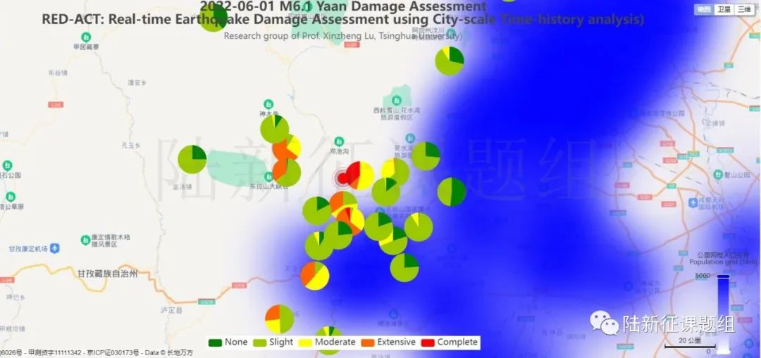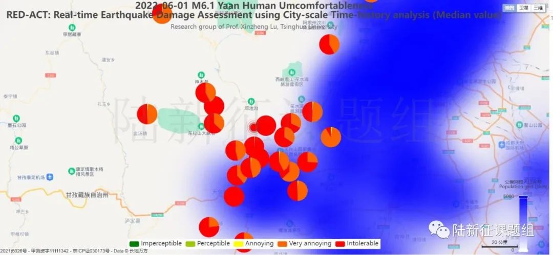 根據(jù)中國(guó)地震學(xué)會(huì)標(biāo)準(zhǔn)《基于強(qiáng)震動(dòng)記錄的地震破壞力評(píng)估T/SSC 1—2021》(參閱新標(biāo)準(zhǔn)發(fā)布 :基于強(qiáng)震動(dòng)記錄的地震破壞力評(píng)估),利用密布強(qiáng)震臺(tái)網(wǎng)在震后獲取的實(shí)時(shí)地震動(dòng)信息,再結(jié)合城市抗震彈塑性分析,就可以得到地震發(fā)生后不同地點(diǎn)的建筑破壞情況,為抗震救災(zāi)決策提供科學(xué)支撐。圖3為根據(jù)本次地震震中附近范圍內(nèi)臺(tái)站記錄分析得到的建筑震害分布示意圖。圖4為根據(jù)本次地震震中附近范圍內(nèi)臺(tái)站記錄分析得到的人員加速度感受分布示意圖。
