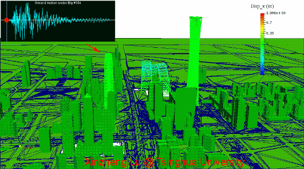 圖2 城市抗震彈塑性分析模擬北京CBD高層建筑群的地震響應(yīng)除了可以將時(shí)程分析從單體建筑推廣到群體建筑,還可以將時(shí)程分析應(yīng)用于滑坡分析。其理由也是相似的:傳統(tǒng)的滑坡分析方法將地震輸入簡(jiǎn)化為一個(gè)烈度或者峰值加速度,不能很好的反映地震動(dòng)的復(fù)雜特性,在我們可以獲得豐富的地面運(yùn)動(dòng)全紀(jì)錄的情況下,時(shí)程分析可以很好的克服傳統(tǒng)方法的缺點(diǎn),所付出的代價(jià)不過(guò)是計(jì)算量大一點(diǎn),不過(guò)相對(duì)于現(xiàn)在的計(jì)算機(jī)分析能力,也是完全可以應(yīng)付的(參閱:新論文:基于實(shí)測(cè)地震動(dòng)的近實(shí)時(shí)地震滑坡預(yù)測(cè)方法(并附源程序))。