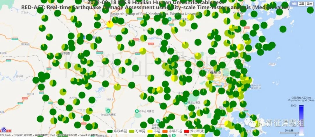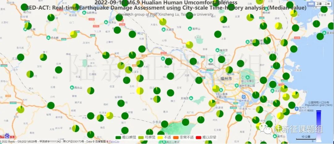 從圖2可以清晰看出,雖然本次地震不會(huì)在大陸地區(qū)引起什么破壞,但是地面加速度造成的人員不適的比例較高。在福州等地,感到“不適”的比例可以接近50%。所以當(dāng)?shù)孛癖姼杏X震感強(qiáng)烈是完全合情合理的。本案例也進(jìn)一步說明了城市抗震彈塑性分析的優(yōu)點(diǎn)。