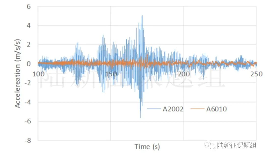 如果我們將兩個(gè)臺(tái)站的地震動(dòng)放在一起對(duì)比,就會(huì)發(fā)現(xiàn),A2002臺(tái)站的地震動(dòng)顯著強(qiáng)于A6010臺(tái)站(圖8)。至于為什么會(huì)有這樣的現(xiàn)象,是因?yàn)閳龅貑栴}還是因?yàn)榈匦螁栴},這個(gè)還有待進(jìn)一步研究。