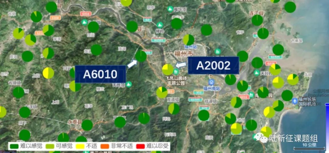 我們可以進(jìn)一步選取兩個(gè)典型臺(tái)站對(duì)比。A2002臺(tái)站和A6010臺(tái)站距離很近,直線距離約10km(圖7)。但是,二者的感受差異非常顯著。
