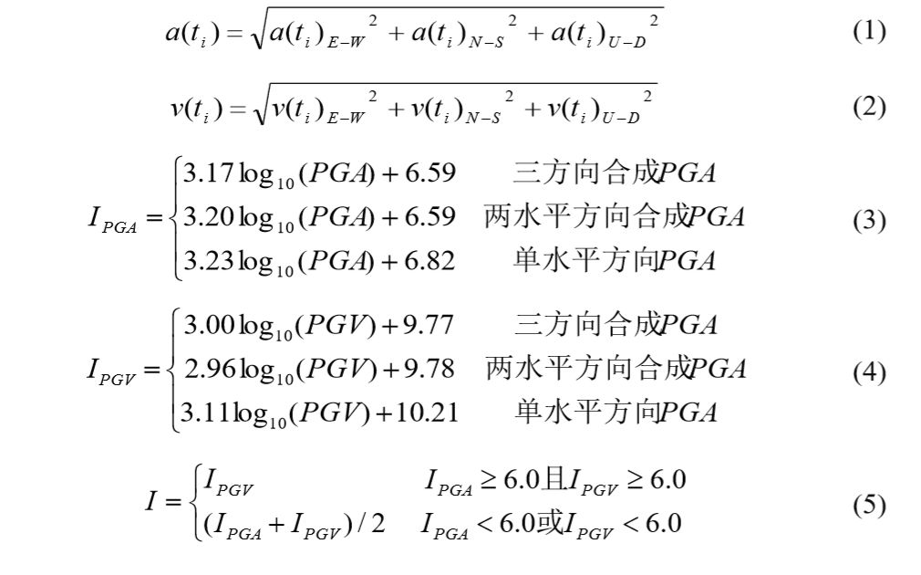 首先根據(jù)式(1)、(2)將三個(gè)方向的地震動(dòng)進(jìn)行合成得到合成地震動(dòng)的PGA和PGV,接著根據(jù)式(3)、(4)和(5)推算得到儀器烈度I、IPGA和IPGV(中國(guó)地震局監(jiān)測(cè)預(yù)報(bào)司, 2015)。