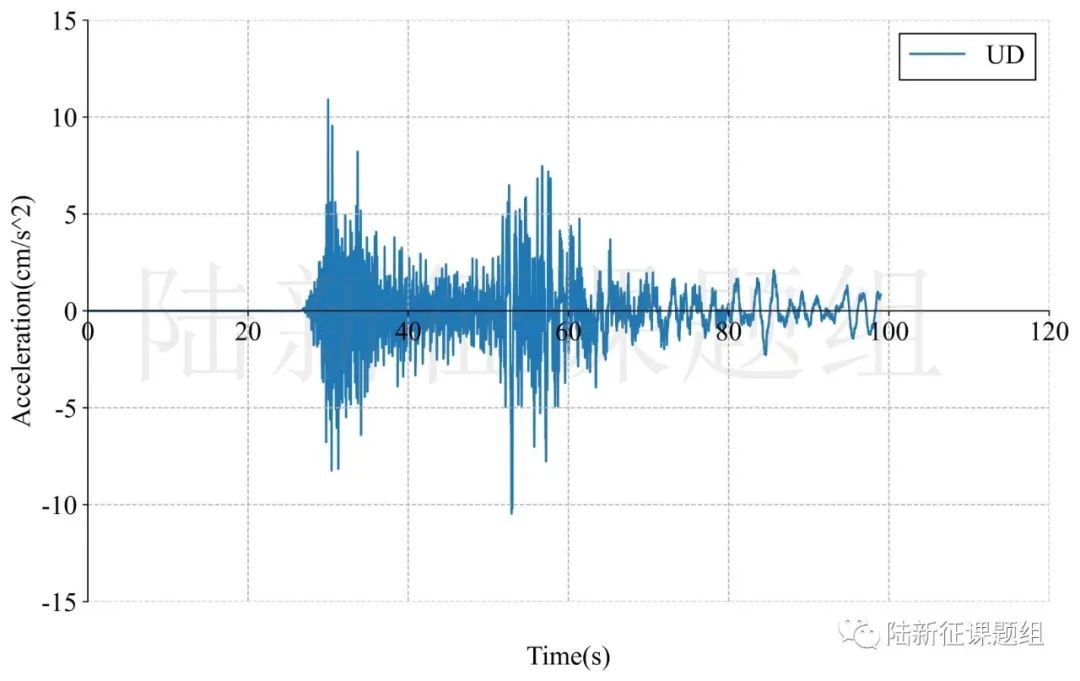 QT001.20典型臺(tái)站位置北緯37.78度,東經(jīng)75.23度,記錄到水平向地震動(dòng)峰值加速度為24cm/s/s,豎直向地震動(dòng)峰值加速度為11cm/s/s。該地震動(dòng)及反應(yīng)譜如圖1、圖2所示。