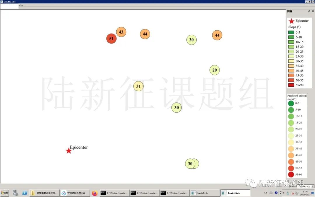 根據(jù)當(dāng)?shù)氐匦螖?shù)據(jù)、巖性數(shù)據(jù)和實(shí)測(cè)地面運(yùn)動(dòng)記錄,可以計(jì)算得到不同滑坡體飽和比例下的滑坡分布,如圖5所示。其中,底圖為當(dāng)?shù)仄露确植紙D,每個(gè)圓圈代表每個(gè)臺(tái)站的計(jì)算結(jié)果,圓圈中的數(shù)字代表發(fā)生滑坡的臨界坡度,臺(tái)站附近坡度大于該數(shù)值的地方滑坡發(fā)生概率高。