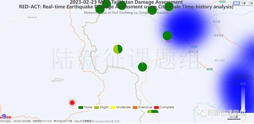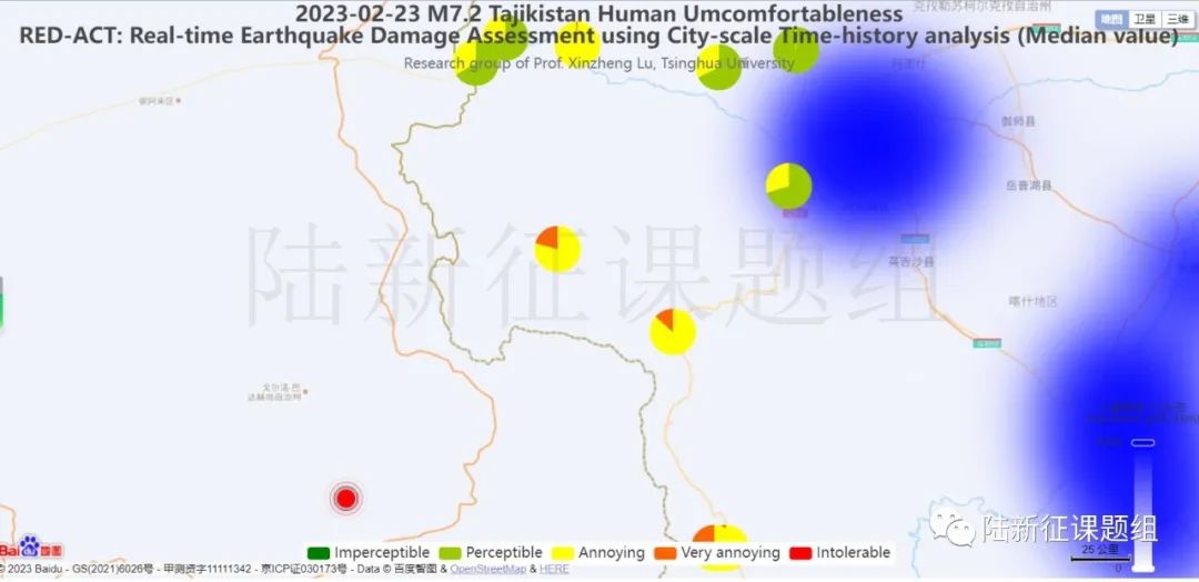 根據(jù)中國(guó)地震學(xué)會(huì)標(biāo)準(zhǔn)《基于強(qiáng)震動(dòng)記錄的地震破壞力評(píng)估T/SSC 1—2021》(參閱新標(biāo)準(zhǔn)發(fā)布 :基于強(qiáng)震動(dòng)記錄的地震破壞力評(píng)估),利用密布強(qiáng)震臺(tái)網(wǎng)在震后獲取的實(shí)時(shí)地震動(dòng)信息,再結(jié)合城市抗震彈塑性分析,就可以得到地震發(fā)生后不同地點(diǎn)的建筑破壞情況,為抗震救災(zāi)決策提供科學(xué)支撐。圖3為根據(jù)本次地震震中附近范圍內(nèi)臺(tái)站記錄分析得到的建筑震害分布示意圖。圖4為根據(jù)本次地震震中附近范圍內(nèi)臺(tái)站記錄分析得到的人員加速度感受分布示意圖。