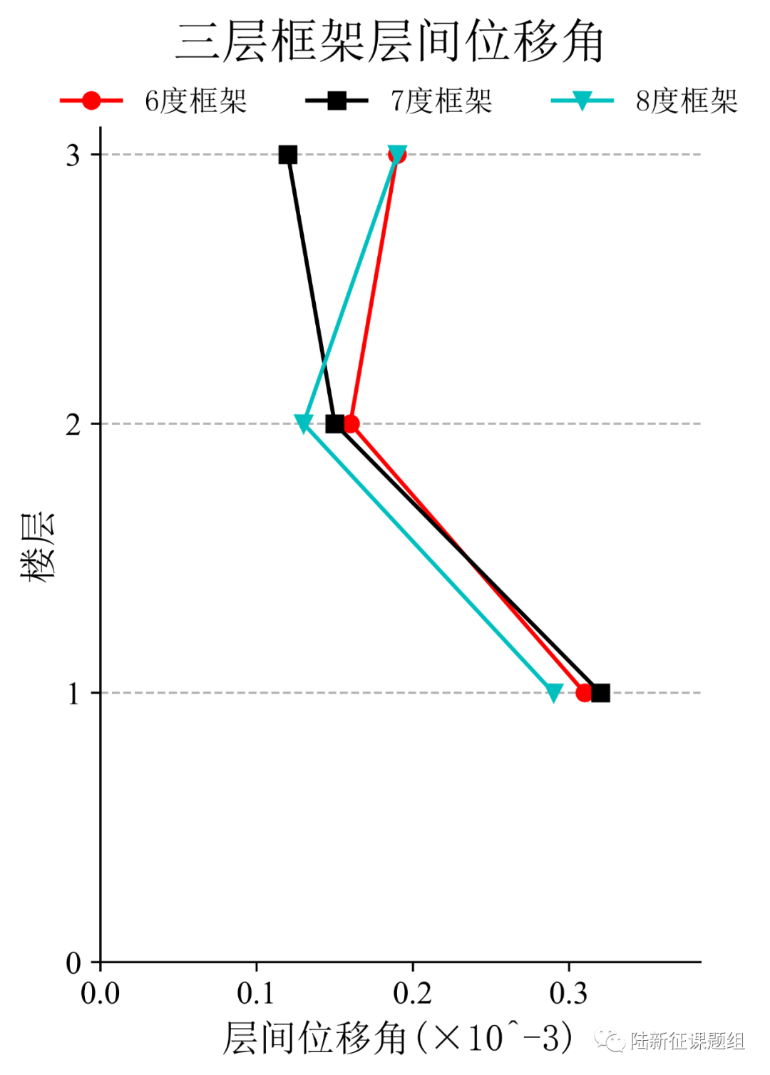將典型臺(tái)站記錄輸入立面布置如圖6(a)所示的6度、7度和8度設(shè)防的典型三層鋼筋混凝土框架結(jié)構(gòu),得到其層間位移角包絡(luò)如圖6(b)所示。