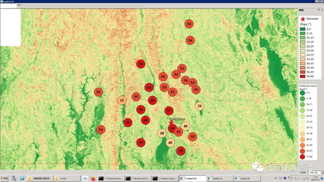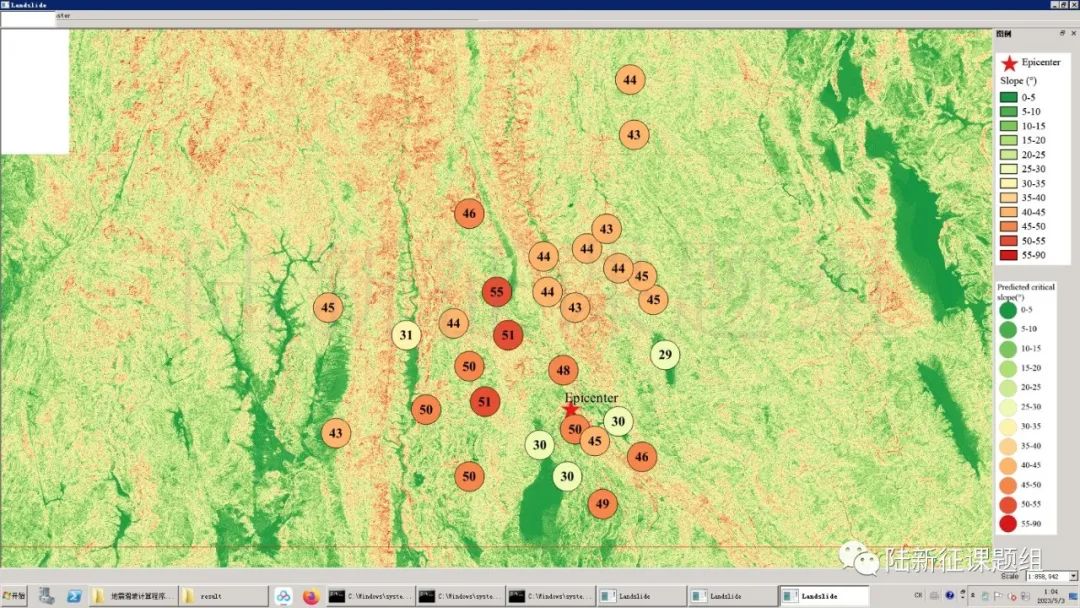 根據(jù)當(dāng)?shù)氐匦螖?shù)據(jù)、巖性數(shù)據(jù)和實(shí)測地面運(yùn)動(dòng)記錄,可以計(jì)算得到不同滑坡體飽和比例下的滑坡分布,如圖5所示。其中,底圖為當(dāng)?shù)仄露确植紙D,每個(gè)圓圈代表每個(gè)臺(tái)站的計(jì)算結(jié)果,圓圈中的數(shù)字代表發(fā)生滑坡的臨界坡度,臺(tái)站附近坡度大于該數(shù)值的地方滑坡發(fā)生概率高。