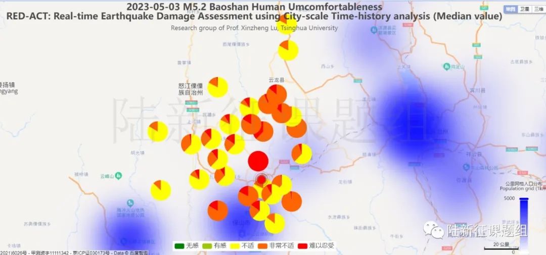 根據(jù)中國地震學(xué)會(huì)標(biāo)準(zhǔn)《基于強(qiáng)震動(dòng)記錄的地震破壞力評(píng)估T/SSC 1—2021》(參閱新標(biāo)準(zhǔn)發(fā)布 :基于強(qiáng)震動(dòng)記錄的地震破壞力評(píng)估),利用密布強(qiáng)震臺(tái)網(wǎng)在震后獲取的實(shí)時(shí)地震動(dòng)信息,再結(jié)合城市抗震彈塑性分析,就可以得到地震發(fā)生后不同地點(diǎn)的建筑破壞情況,為抗震救災(zāi)決策提供科學(xué)支撐。圖3為根據(jù)本次地震震中附近范圍內(nèi)臺(tái)站記錄分析得到的建筑震害分布示意圖。圖4為根據(jù)本次地震震中附近范圍內(nèi)臺(tái)站記錄分析得到的人員加速度感受分布示意圖。
