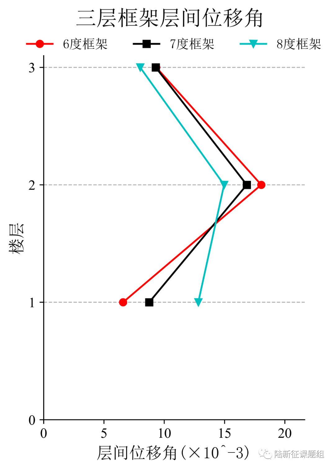 將典型臺(tái)站記錄輸入立面布置如圖6(a)所示的6度、7度和8度設(shè)防的典型三層鋼筋混凝土框架結(jié)構(gòu),得到其層間位移角包絡(luò)如圖6(b)所示。