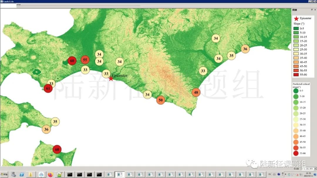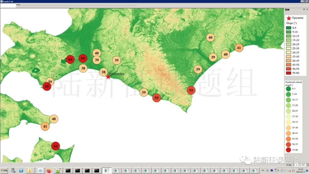 根據(jù)當(dāng)?shù)氐匦螖?shù)據(jù)、巖性數(shù)據(jù)和實(shí)測(cè)地面運(yùn)動(dòng)記錄,可以計(jì)算得到不同滑坡體飽和比例下的滑坡分布,如圖5所示。其中,底圖為當(dāng)?shù)仄露确植紙D,每個(gè)圓圈代表每個(gè)臺(tái)站的計(jì)算結(jié)果,圓圈中的數(shù)字代表發(fā)生滑坡的臨界坡度,臺(tái)站附近坡度大于該數(shù)值的地方滑坡發(fā)生概率高。