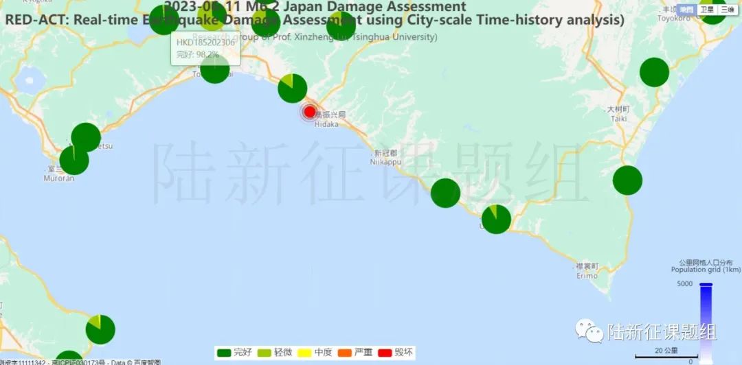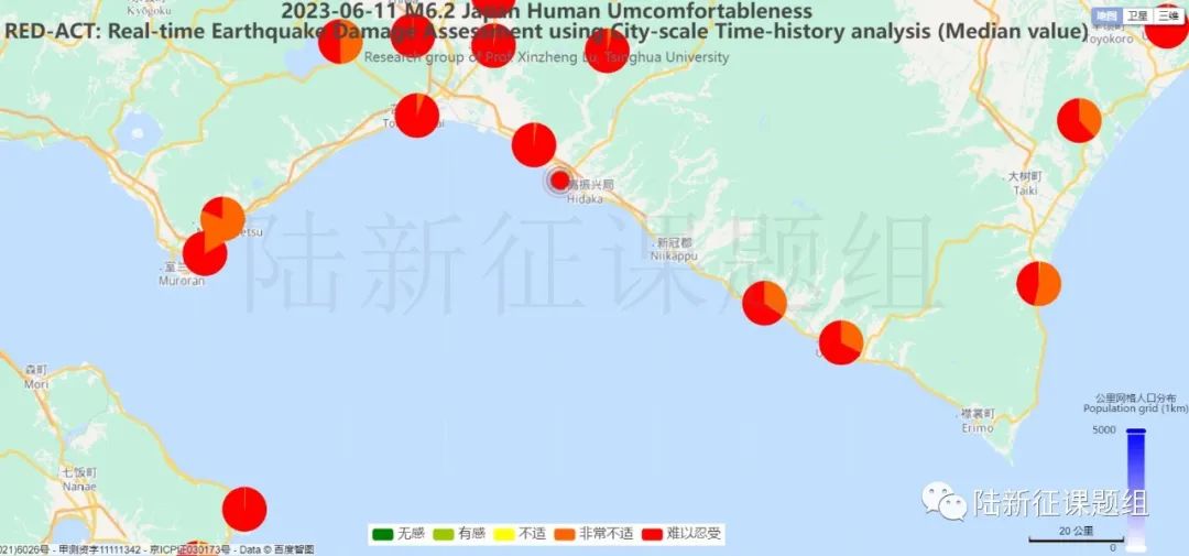 根據(jù)中國(guó)地震學(xué)會(huì)標(biāo)準(zhǔn)《基于強(qiáng)震動(dòng)記錄的地震破壞力評(píng)估T/SSC 1—2021》(參閱新標(biāo)準(zhǔn)發(fā)布 :基于強(qiáng)震動(dòng)記錄的地震破壞力評(píng)估),利用密布強(qiáng)震臺(tái)網(wǎng)在震后獲取的實(shí)時(shí)地震動(dòng)信息,再結(jié)合城市抗震彈塑性分析,就可以得到地震發(fā)生后不同地點(diǎn)的建筑破壞情況,為抗震救災(zāi)決策提供科學(xué)支撐。圖3為根據(jù)本次地震震中附近范圍內(nèi)臺(tái)站記錄分析得到的建筑震害分布示意圖。圖4為根據(jù)本次地震震中附近范圍內(nèi)臺(tái)站記錄分析得到的人員加速度感受分布示意圖。