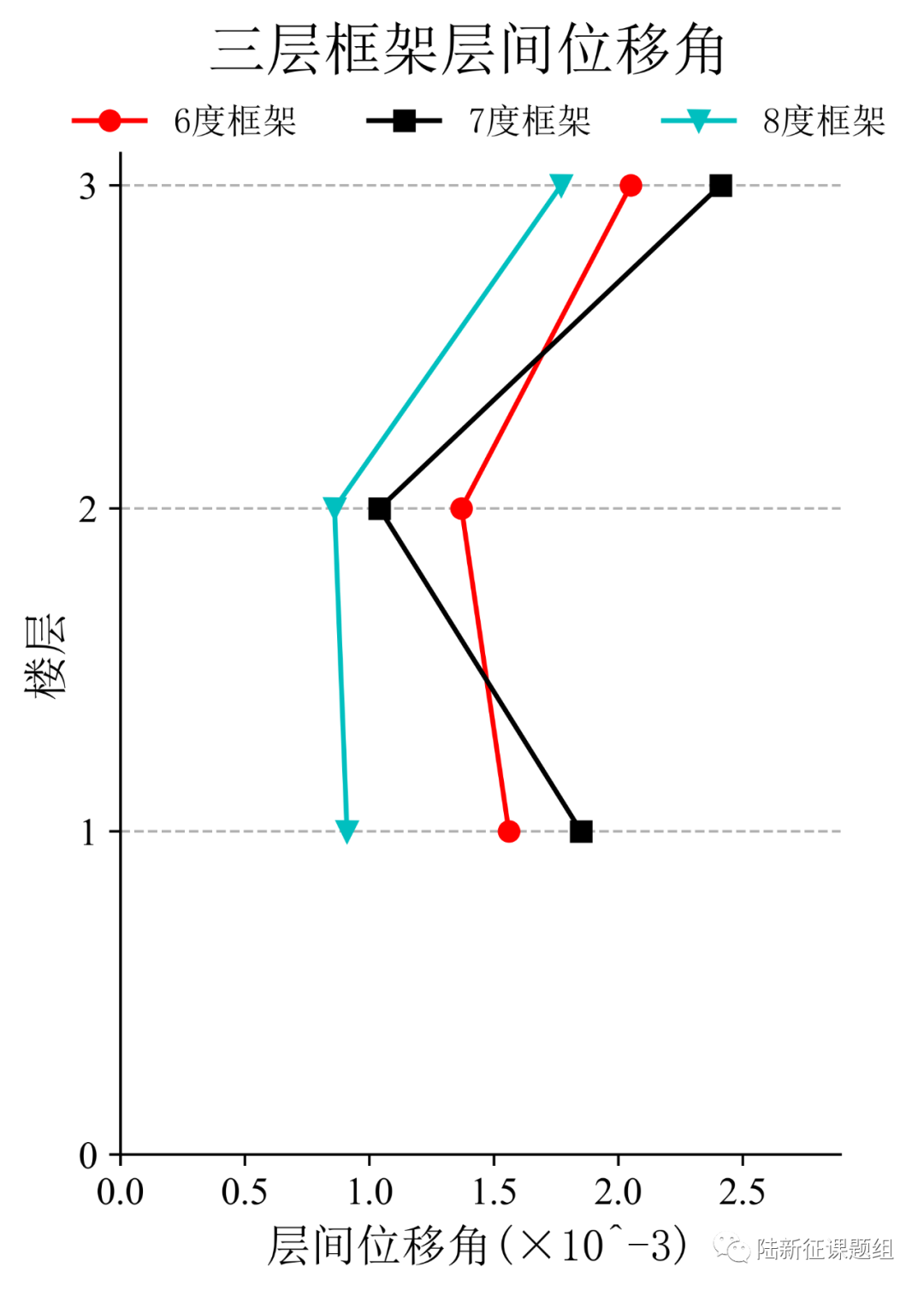 將典型臺(tái)站記錄輸入立面布置如圖6(a)所示的6度、7度和8度設(shè)防的典型三層鋼筋混凝土框架結(jié)構(gòu),得到其層間位移角包絡(luò)如圖6(b)所示。