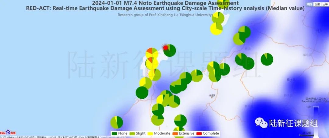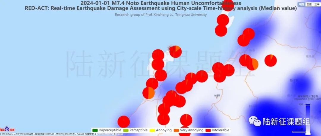 根據(jù)中國地震學(xué)會(huì)標(biāo)準(zhǔn)《基于強(qiáng)震動(dòng)記錄的地震破壞力評估T/SSC 1—2021》(參閱新標(biāo)準(zhǔn)發(fā)布 :基于強(qiáng)震動(dòng)記錄的地震破壞力評估),利用密布強(qiáng)震臺(tái)網(wǎng)在震后獲取的實(shí)時(shí)地震動(dòng)信息,再結(jié)合城市抗震彈塑性分析,就可以得到地震發(fā)生后不同地點(diǎn)的建筑破壞情況,為抗震救災(zāi)決策提供科學(xué)支撐。圖3為根據(jù)本次地震震中附近范圍內(nèi)臺(tái)站記錄分析得到的建筑震害分布示意圖。圖4為根據(jù)本次地震震中附近范圍內(nèi)臺(tái)站記錄分析得到的人員加速度感受分布示意圖。