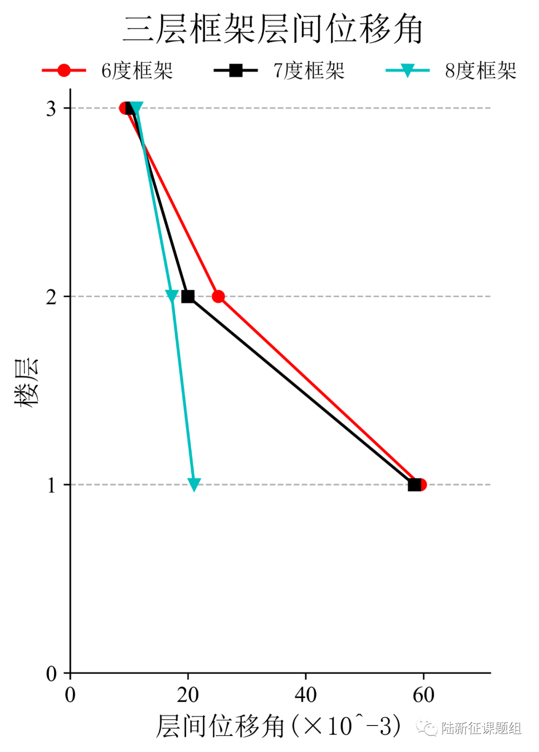將典型臺(tái)站記錄輸入立面布置如圖6(a)所示的6度、7度和8度設(shè)防的典型三層鋼筋混凝土框架結(jié)構(gòu),得到其層間位移角包絡(luò)如圖6(b)所示。