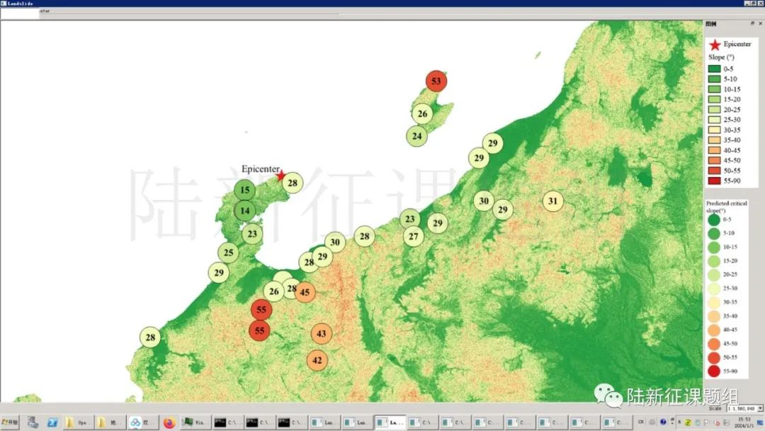 根據(jù)當(dāng)?shù)氐匦螖?shù)據(jù)、巖性數(shù)據(jù)和實(shí)測地面運(yùn)動(dòng)記錄,可以計(jì)算得到不同滑坡體飽和比例下的滑坡分布,如圖5所示。其中,底圖為當(dāng)?shù)仄露确植紙D,每個(gè)圓圈代表每個(gè)臺(tái)站的計(jì)算結(jié)果,圓圈中的數(shù)字代表發(fā)生滑坡的臨界坡度,臺(tái)站附近坡度大于該數(shù)值的地方滑坡發(fā)生概率高。